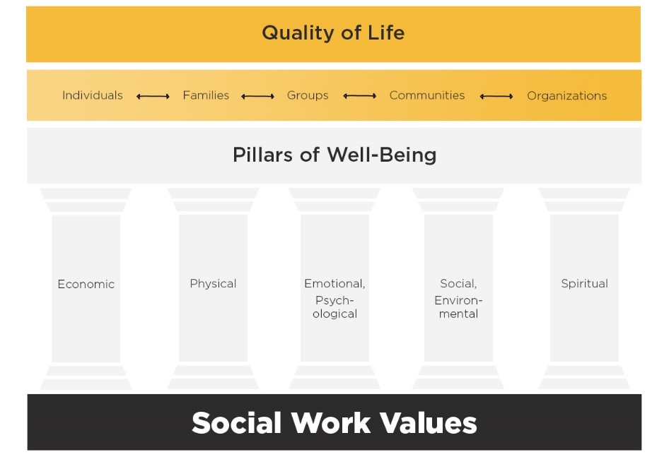 Understanding that socioeconomic determinants of health, marginalization and poverty dramatically impact well-being within our own community, the program is designed specifically to train students to intervene in the infrastructure of communities and the challenges of daily living that impede quality of life. It is only by creating, restoring or stabilizing these “pillars” of well-being that we can aid our constituencies – individuals, families, groups, organizations and communities – in meeting their full potential and the professions purpose of promoting human well-being. Teaching concepts, models and interventions that support economic, physical, emotional/psychological, social/environmental, and spiritual wellness will allow our graduates to be skilled in developing, supporting and restoring these vital pathways to quality of life. We focus on what we can do to improve lives, prevent crisis, build community, reject marginalization and promote equality and understanding. This includes taking a proactive interest in the lives of communities and therefore always tending to the continuum and fluidity between micro and macro practice, serving not just individuals families and groups, but also organizations and communities.